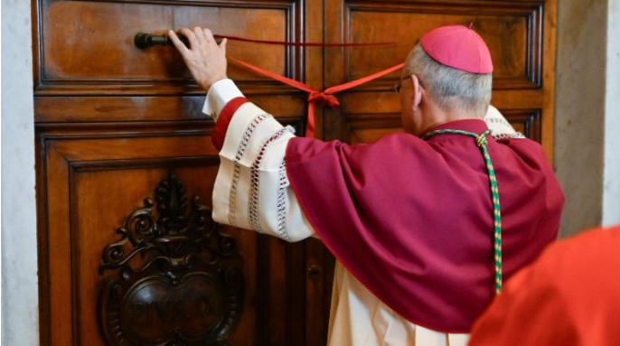 6.صندلی خالی(سِدی واکَنتآلهSede Vacante)واتیکان وارد دورانی بدون پاپ شده و کامرلنگو امور روزمره را اداره میکند اما مجاز به اتخاد تصمیمات مهمی نیست.همچنین نشان پاپ برای نشان دادن جای خالی تغییر میکند (بدون کلید یا تاج پاپ) و حاکمیت کلیسا محدود میشود.دفتر رسولی(دفتر پاپ) رسما بسته و تا انتخاب پاپ بعدی، کسی در آن حاضر نمی شود.